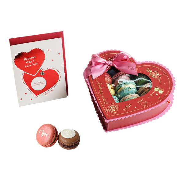 Presented in a tamarillo red hard box adorned with gold-foiled doodles and soft pink scallop details, finished with a delicate pink ribbon. Inside, twelve macarons of your choice — each a small moment of sweetness — accompanied by a Reasons Why I Love You greeting card, made for words that matter.