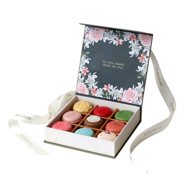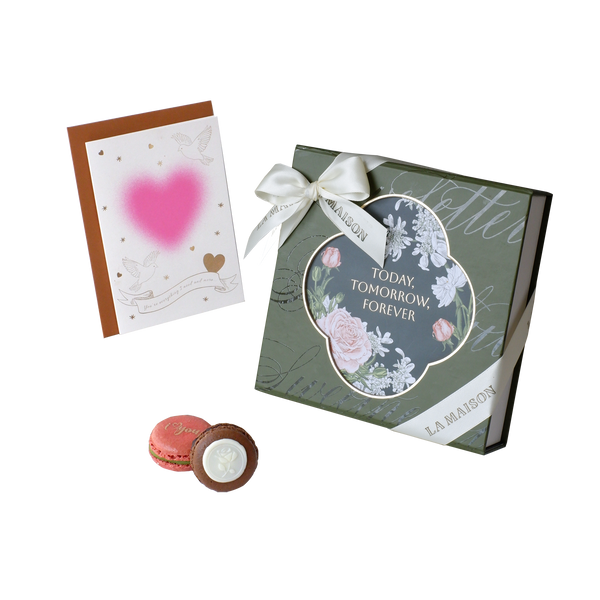 Inside, a gentle promise revealed in gold — to: you, always. from: me, still. A box of 9 macarons, featuring our two Valentine specials — Ceremonial Matcha & Strawberry and Black Forest — alongside your choice of La Maison signature flavors, complete with a greeting card for words meant to last.